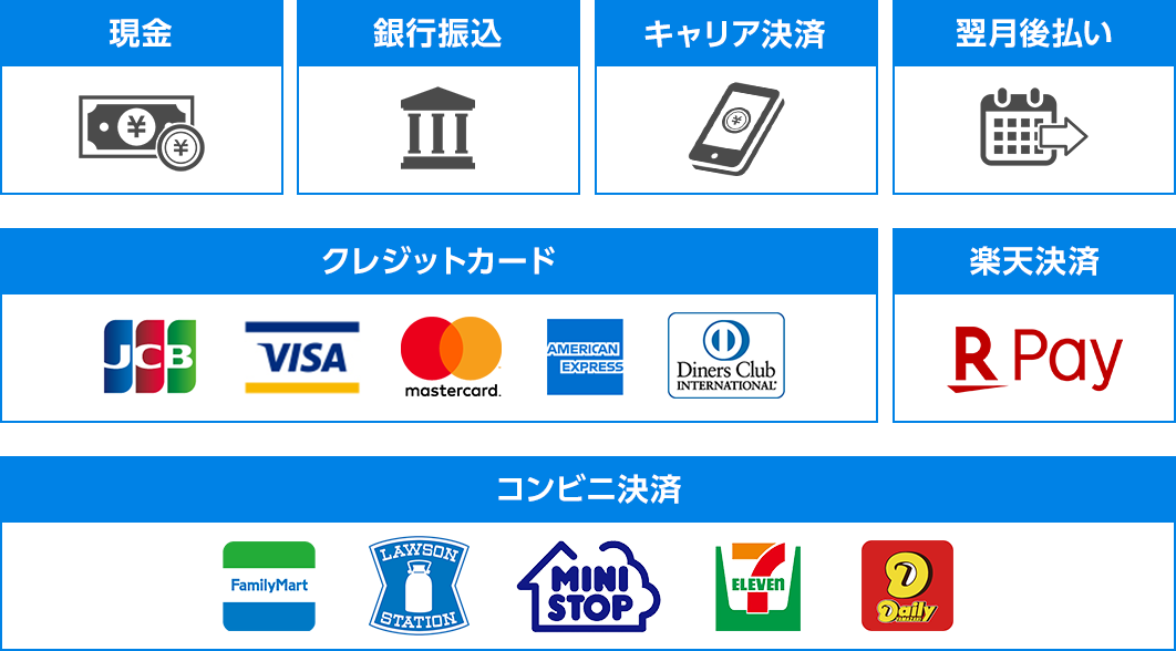 現金・クレジットカード・翌月後払い・キャリア決済・楽天決済・お振込み